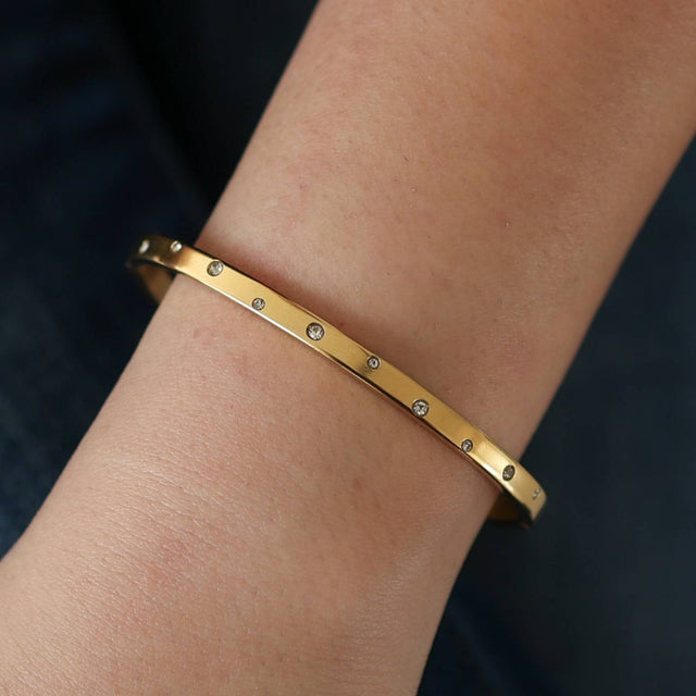 Bewust vervaardigd: Deze armband is gemaakt van recyclebaar roestvrij staal met een laagje 14-karaats gerecycled goud en zirkonia. Hij is bestand tegen verkleuring, hypoallergeen en milieuvriendelijk – ontworpen om jarenlang te blijven schitteren.