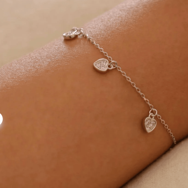 De Sparkle Heart-armband voegt een subtiele glans toe aan je dagelijkse look. Hij is voorzien van drie kleine hartvormige bedeltjes bezet met zirkonia steentjes. Draag hem los voor een ingetogen glans of combineer hem met andere armbanden voor een romantische look. Een lief en duurzaam cadeau voor een geliefde, of voor jezelf.
